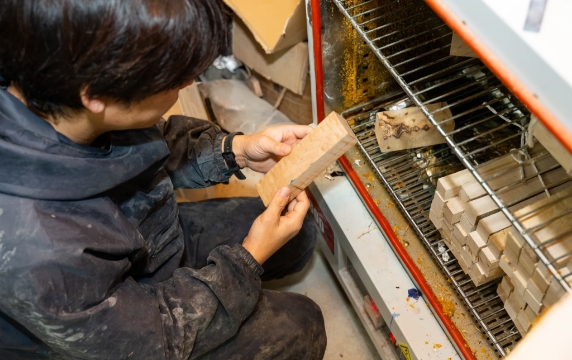 最初に行うのは木材の選別と乾燥です。内部に腐りや大きな割れがない木を選び、水分をほぼ完全に抜きます。水分が残っていると、この後の工程で樹脂が入りません。