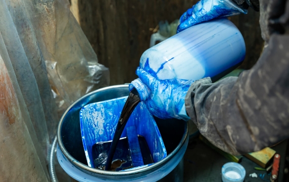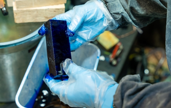 そのままの状態で樹脂を流し込みます。真空を解除すると、外からの圧力で樹脂が木の奥深くまで吸い込まれます。この樹脂に染料を混ぜることで美しい発色を得られます。